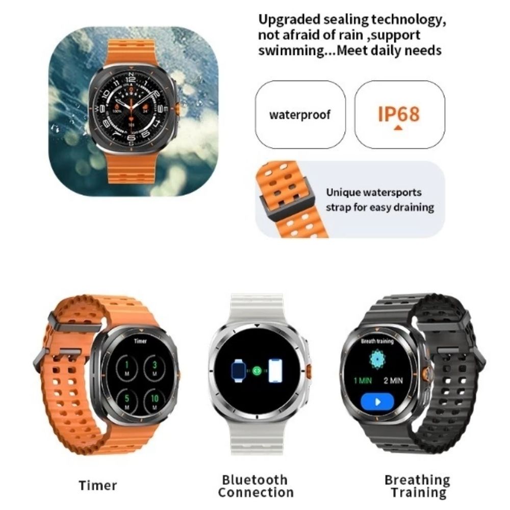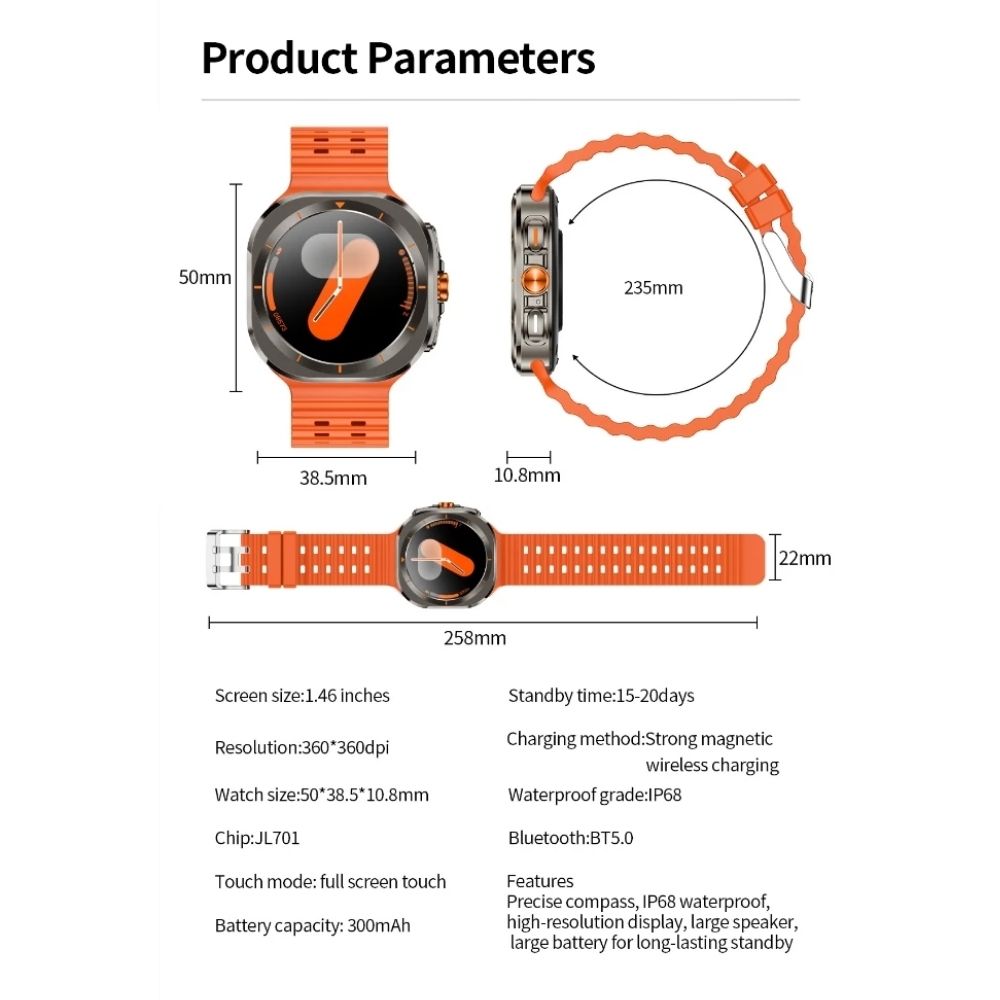 The Galaxy X7 Ultra in Black comes with a 1.43-inch AMOLED display, blood glucose monitoring, Bluetooth calling, built-in compass, and IP68 waterproof protection. With a 400mAh battery and sports tracking, it’s designed for outdoor activities and daily health monitoring.