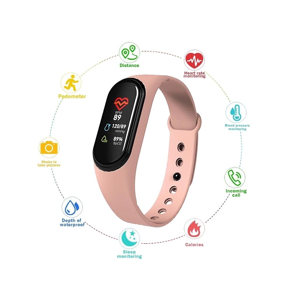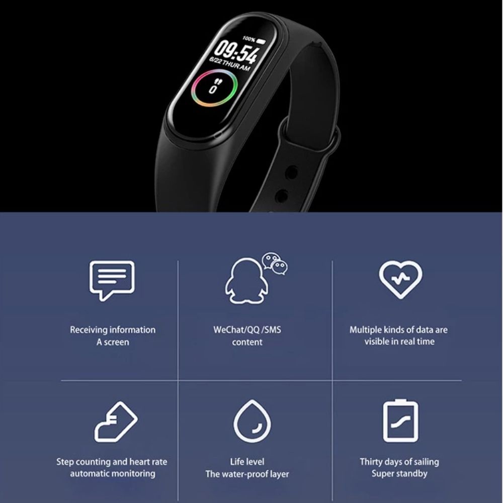 The M4 Smart Bracelet in Black is a slim and comfortable wristband offering heart rate monitoring, step counter, sleep tracking, calorie burn measurement, and notifications. Designed for daily fitness and casual wear, it’s perfect for active lifestyles.